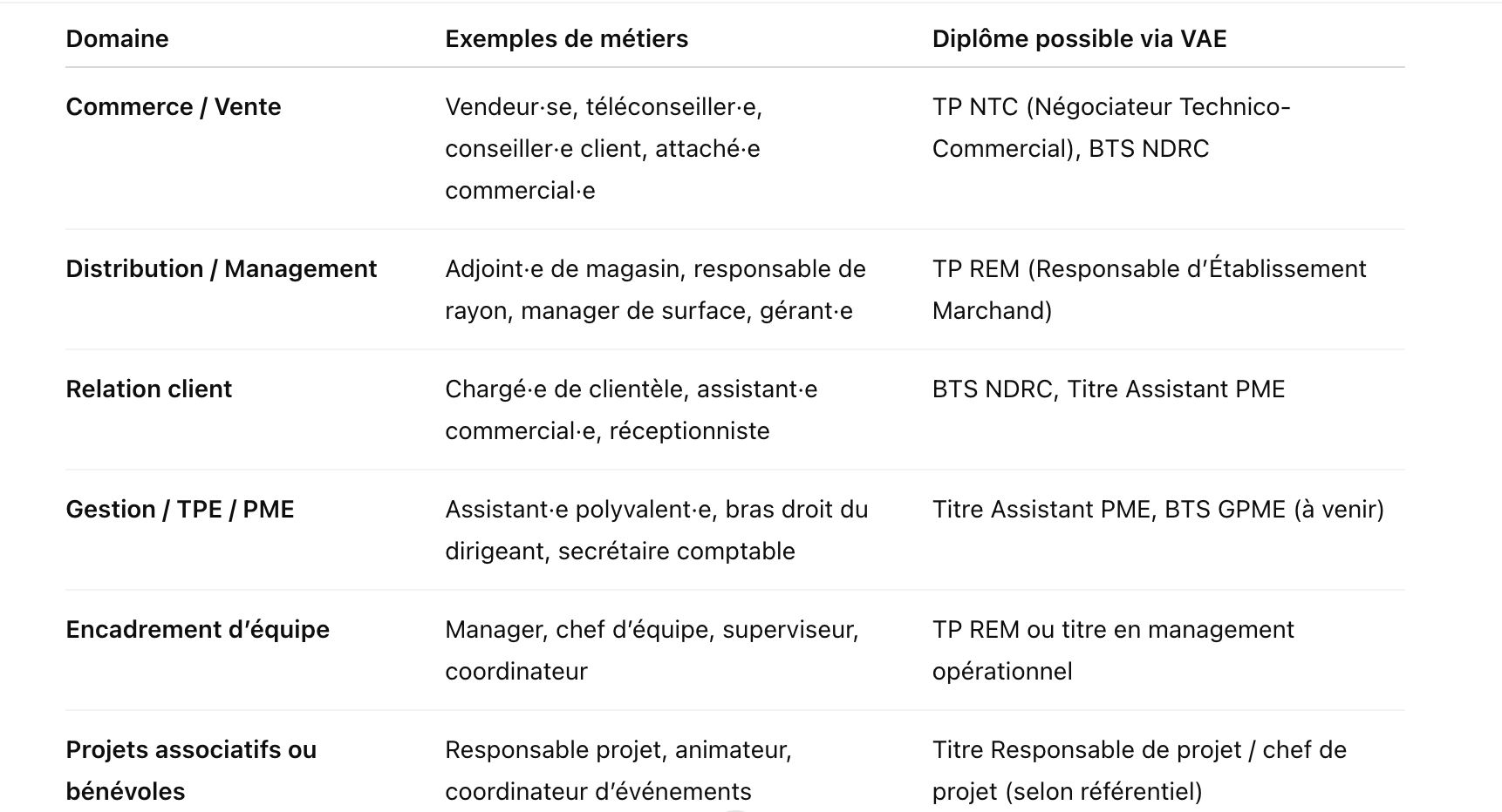 🛍️ Exemples de métiers validables en VAE (et diplômes associés)