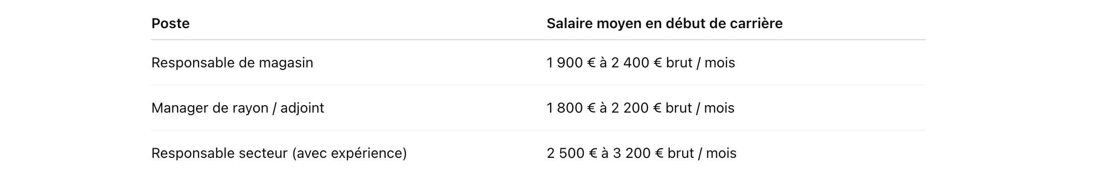 Le salaire dépend de plusieurs critères : secteur d’activité, taille de l’enseigne, région, expérience et ancienneté. Voici des fourchettes indicatives :